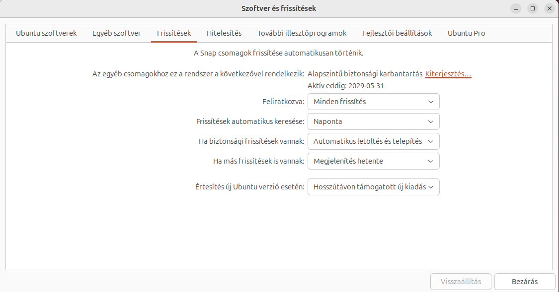 Magam valójában nem kedvelem az automatizált frissítést, ezért az egyetlen általam felügyelt, de fizikailag távolabb eső rendszeren sincs bekapcsolva. Ubuntun, Minten a fentebb vázoltak szerint jelzi a rendszer, ha frissítés elérhető, de a felhasználó szabadsága, hogy mikor indítja el a folyamatot. Olyankor, amikor őt nem zavarja, hogy fut, amikor nem szeretné két percen belül kikapcsolni a gépet.