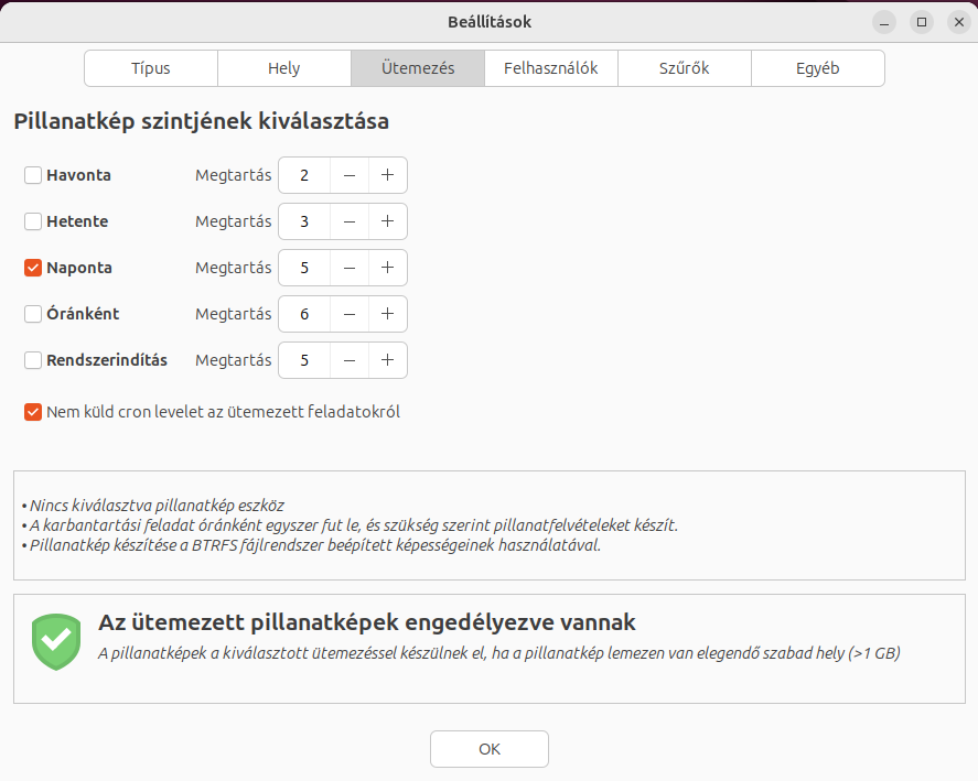 A Debianok saját gépeken futnak. Itt csak .deb csomagokat használok, biztos nincs telepítve Snap vagy Flatpak és nincs is olyan grafikus felületen futó szoftveráruház, ahol a felhasználó könnyedén ilyet fel tudna tenni, úgyhogy teljesen jó a systemback.sh rendszermentésre. Bár be tudnám rajtuk állítani, hogy automatikusan jelezzék, ha elérhető frissítés, de felesleges, megmaradtam a kézi terminálos megoldásnál. A rendszer-visszaállítási pontot a magam által használt rendszereken (legyen az Ubuntu, Mint vagy akár Debian) gyakrabban készítek, mert ezeket a rendszereket hajlamos vagyok jobban ütni-vágni, kísérletezni velük és néha nem jól sül el a mutatvány.