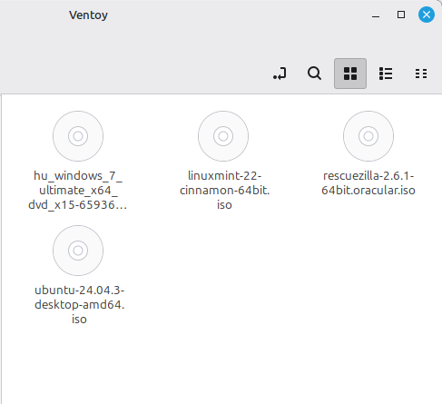 A létrejött Ventoy partícióra rámásoltam három lemezképet: Ubuntu 24.04, Linux Mint 22 Cinnamon és Windows 7.